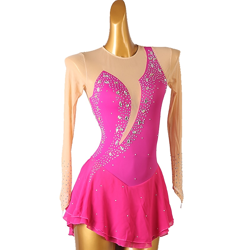 Figure Skating Dress Women's Girls' Ice Skating Dress Orange Rose Red Patchwork Open Back Mesh High Elasticity Training Competition Skating Wear Classic Crystal / Rhinestone Long Sleeve Ice Skating 17