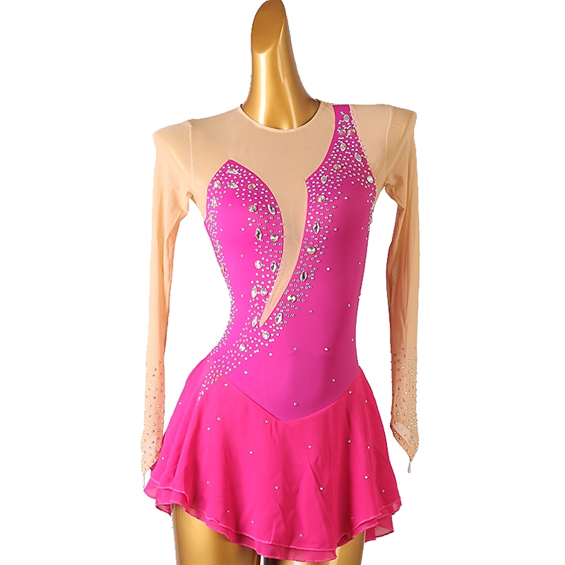 Figure Skating Dress Women's Girls' Ice Skating Dress Orange Rose Red Patchwork Open Back Mesh High Elasticity Training Competition Skating Wear Classic Crystal / Rhinestone Long Sleeve Ice Skating 15