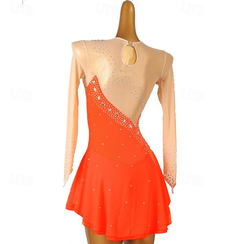 Figure Skating Dress Women's Girls' Ice Skating Dress Orange Rose Red Patchwork Open Back Mesh High Elasticity Training Competition Skating Wear Classic Crystal / Rhinestone Long Sleeve Ice Skating 11