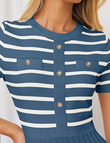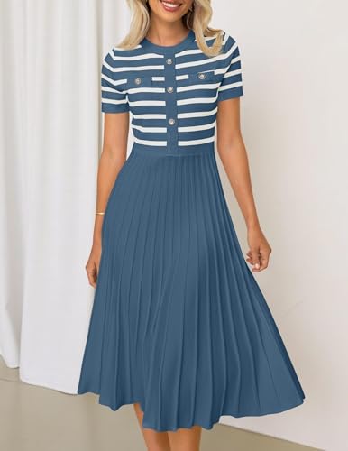 Women's Striped Knit Ribbed Wear to Work Dress, Short Sleeve Pleated A-Line Business Dress 2025