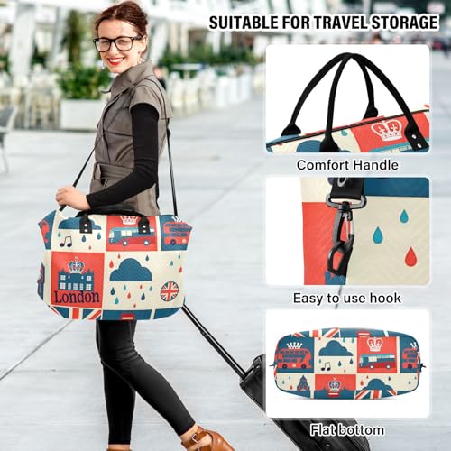 London British Flag Cartoon Large Travel Duffle Bag Weekender Overnight Bags Gym Yoga Bag for Women Men with Toiletry Bag