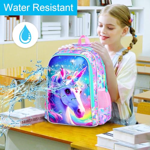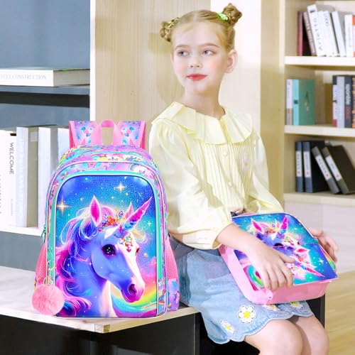 3PCS Girls Unicorn Backpack, 16" Kids Bookbag with Lunch Box, Water Resistant Elementary School Bag for Preschool Toddler