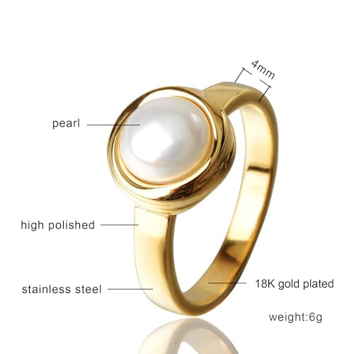 Ring size: 5Material: Simulated PearlMetal type: Stainless SteelMetal weight: 1 gGem type: Created PearlUNIQUE GIFT: Impress your loved ones by gifting this gorgeous pearl ring, an ideal present for special occasions like birthdays, weddings, or other important events. A memorable gift for anyone's pearl jewelry collection, this gold plated engagement ring will maintain sentimental value for years to come.Details: Style: Chic/Novelty 18k Gold Plated Polished Finish Dimensions: 3mm Width, 5g Weight Made of first-class 8mm Pearls Available in Ladies Sizes 5,6, 7, 8, 9,10.WEDDING SYMBOLISM: For centuries, pearls have been synonymous with weddings and eternal love. Ancient Greeks believed that pearls worn by the bride would help promote harmony in the relationship. As a sign of everlasting love and purity, this pearl engagement ring is a charming way to symbolize the commitment to your significant other on your special day.Perfect for all occasions: anniversary, wedding, engagement, party, ceremony, cocktail, dating, daily wear, etc.Satisfactory Service: You can contact our service in any time if you have any questions about jewelry, and we will give our respond to You within 24 hours. Perfect for everyday use. High quality materials and excellent craftsmanship ensure long-lasting durability.