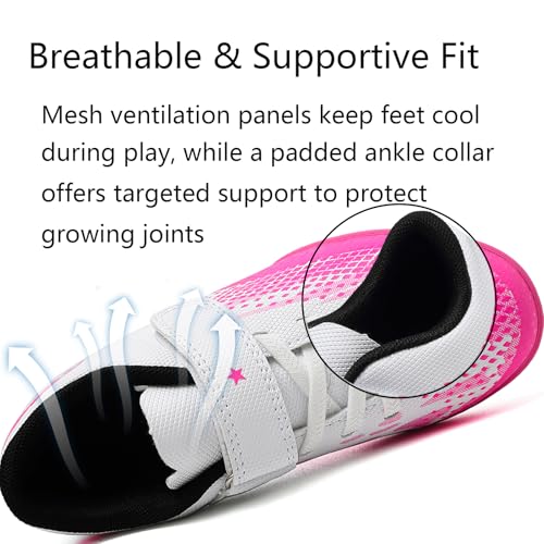 Sole material: RubberOuter material: SyntheticClosure type: Hook & LoopThe kids turf soccer shoes, upper is made of synthetic material,lightweight and wear-resistant,providing the excellent ball control.The cozy kids indoor soccer shoes have adjustable hook and loop="" strap design makes it easier for children to put on and take off.Besides,it is more safer and reliable while playing soccer.The youth soccer cleats non-slip rubber sole design helps children control the ball well, offering good support and grip.The kids turf soccer shoes provide outstanding breathability,keeping your child's feet dry and comfortable all the time.The kids soccer shoes are suitable for many occasions,soft ground,hard ground,natural grass,rubber playground,artificial ground,rugby field,gymnasium. Perfect for everyday use. supreme materials and excellent craftsmanship ensure long-lasting durability.