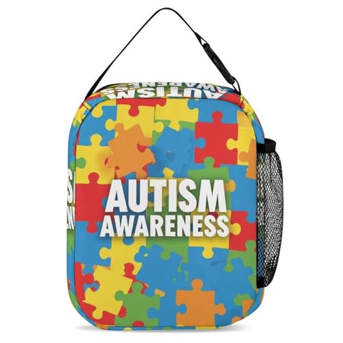 Backpack Bookbag Set Autism Awareness Colorful Puzzles Backpack with Lunch Bags and Makeup Bag Shoulder Bag with Lunch Box Storage Bags