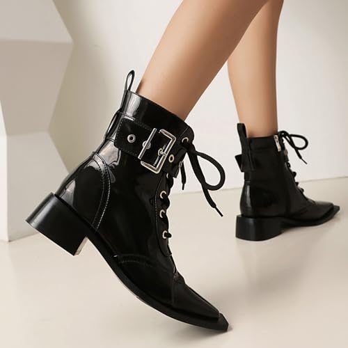 • Charming Design: These Women's Ankle Boots Feature a up-to-date Square Toe, Patent Leather Fabric for Texture, and a Lace-Up and Zipper Design for Adjustability;These Short Booties are Versatile, Perfect for Pairing with Different Types of Pants and Casual Mid Dresses to Update Any Outfit.