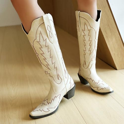 Sole material: RubberShaft height: Calf HighOuter material: SyntheticClosure type: Pull-OnMid Calf Cowgirl Boots: Women cowboy boots with closed toe, cozy chunky mid heel show good figure of body and produce the pressure of calf, and the pull on makes it easy on and offEmbroidered Western Boots: Women wide calf boots are an essential item in your wardrobe, make you look the most glamorous at parties, weddings, music festivals, parties, Christmas, Halloween, weddings, birthdaysChunky Block Boots: Womens cowboys showcase a pointed toe and embroidered, exuding timeless elegance and making them an excellent choice for both casual and work occasionsComfortable Fit: Designed as western cowgirl boots for women, womens mid calf boots ensure comfort for extended wear at work, events, or casual outingsElegant Western Boots: The chunky heel booties adds a touch of sophistication and height while offering stability, ensuring you can walk with confidence and grace wherever you go Perfect for everyday use. supreme materials and excellent craftsmanship ensure long-lasting durability.