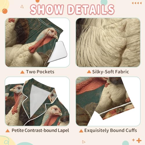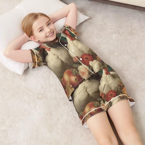 Satin Pajama Sets Short Sleeve Two Turkeys Thanksgiving Button Down Silky Nightwear 2 Piece PJS 5-14Y