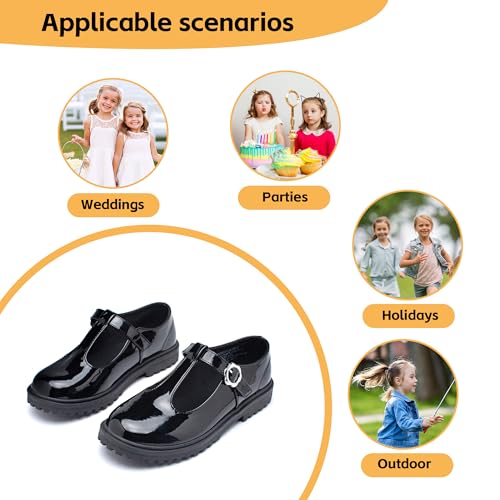 Sole material: RubberOuter material: Faux LeatherClosure type: Hook & LoopWater resistance level: Not Water Resistant🎀【Vintage T-Strap Style】 The distinctive T-shape design used on the girls' round-toe shoes makes for a glittery look while the girls look confident and comfortable with every step.🎀【Velcro & Metal Clips】 Strong and durable velcro makes girl's Mary Jane shoes easy and comfortable to wear. Embellished with the silver metal buckle, girls look youthful and energetic in them. These princess shoes are definitely the most dazzling pair at school parties!🎀【Non-slip Outsole & Latex Insole】 Low heel dress shoes for girls with textured non-slip rubber soles provide better grip and balance on any surface.The eco-friendly latex insoles make the girls feel softer and more comfortable, so no matter how far they walk, they won't feel their feet hurting.🎀【100% Faux Leather Upper】 We choose high-quality artificial leather material as the fabric, sophisticated and simple, comfortable and versatile, your kid's shoe wardrobe is very much in need of a pair of good-looking dress shoes.🎀【Gifts & Every Occasion】: Girls uniform shoes as perfect gifts for your kids.These girls’ dress shoes are the perfect choice for any event, from princess dress-ups to school days to special occasions like weddings, parties, holidays, or graduations.Put on the patent leather shoes and your girl will never want to take them off again! Perfect for everyday use. first-class materials and excellent craftsmanship ensure long-lasting durability.