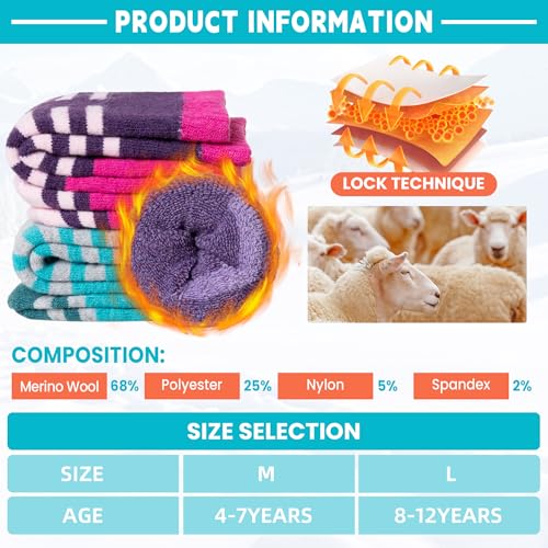 • top-grade- The ski wool socks for kids are made of 68% Merino Wool, 25% Polyester, 5% Nylon, 2% Spandex, These material are wear-resistant , durable , and temperature regulation, These thermal thermal socks will keep little toes warm for children in cold weather.
