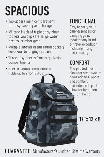 SPACIOUS: Top-access main compartment for easy packing and storage, military-inspired triple daisy chain top lets you clip keys, large water bottles, or other gear, multiple interior organization pockets keep your belongings secure, three easy-access front organization compartments, interior laptop compartment holds up to a 15 laptop, side water bottle pockets for easy hydration on the goFUNCTIONAL: Easy to carry your daily essentials or camping gear. Ideal for any kind of travel expedition including hiking and camping.COMFORT: The padded mesh shoulder strap system gives added support and comfort, and side mesh pockets allow for hydration on the go.DIMENSIONS: 17 x 13 x 8GUARANTEE: Manufacturer's Limited Lifetime Warranty Perfect for everyday use. High quality materials and excellent craftsmanship ensure long-lasting durability.