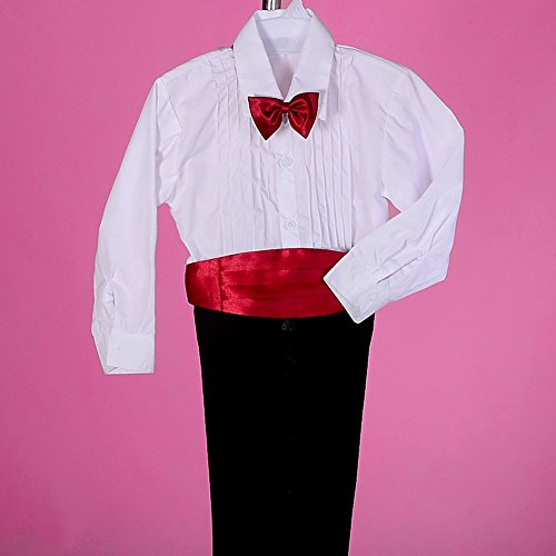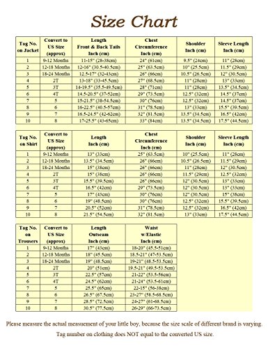 Fabric type: 65% Polyester, 35% CottonCare instructions: Machine Wash, Tumble Dry LowOrigin: Imported5 Pieces boys tuxedo formal suit set: Tuxedo jacket with tails, White dress shirt, Adjustable bow tie, Cummerbund and Pants. Made of luxurious polyester fabric with solid satin details.Fully lined double breasted tux jacket with jacquard shawl lapel matching a tradition white pintuck pleated shirt with 1 button cuff. Looking great with a bowtie at the vintage tuxedo wing tip collar.Elegant satin stripe tuxedo pants with elastic waistband for comfort and perfect fit. Complete the smart look with a jacquard cummerbund.Color: Black / White / Black with red cummerbund. Perfect gentleman outfit for many special occasions: Wedding, birthday, evening dinner party, special events, formal ceremony, opera, ocean cruise, Christmas gala, new year eve, prom, Halloween dress up etc.Size for baby, toddler and little kids. 9-12 months, 12-18 months, 18-24 months, 2T, 3T, 4T, 5, 6, 7 and 8. The range is for reference, please measure the actual body size and refer to the size chart to choose a proper size for best fit. There may be minor size difference depending on size measuring method.γNOTEγTag number on clothing DOES NOT equal to the converted US size. Perfect for everyday use. first-class materials and excellent craftsmanship ensure long-lasting durability.