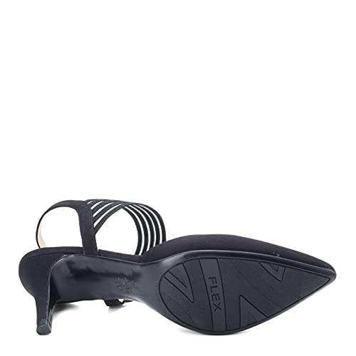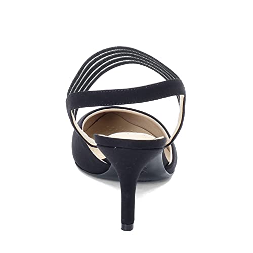 • cushy womens high heel shoes with microsuede upper with a pointed toe, heel sling strap, and striped stretch gore strap