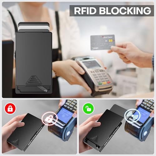 in-demand ! Slim Card Holder Wallet For Men, Mens Pop Up Wallet RFID Blocking,Thumb Swipe,Minimalist Wallet Metal Aluminum With Money Slot,Holds 1-8 cards,Add-On Cash Pocket (Jet Black)