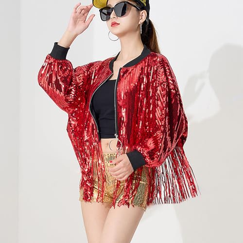 Women's Short Sequin Fringes Jacket Coat Long Sleeve Zipper Blazer Bomber Racing Jacket Club Party Rave Outfits