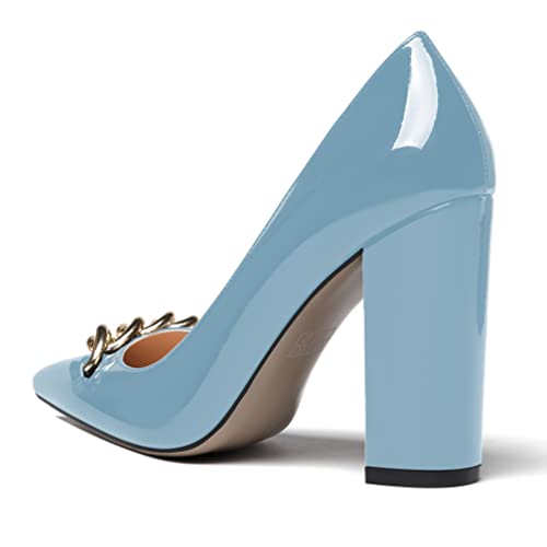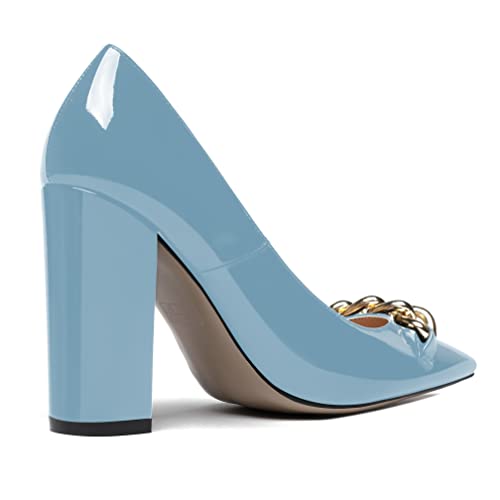 WAYDERNS Women's Pointed Toe Slip On Patent Metal Chain Thick Block High Heel Pumps Shoes 4 Inch