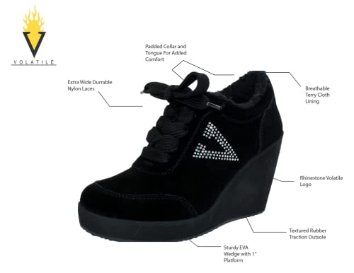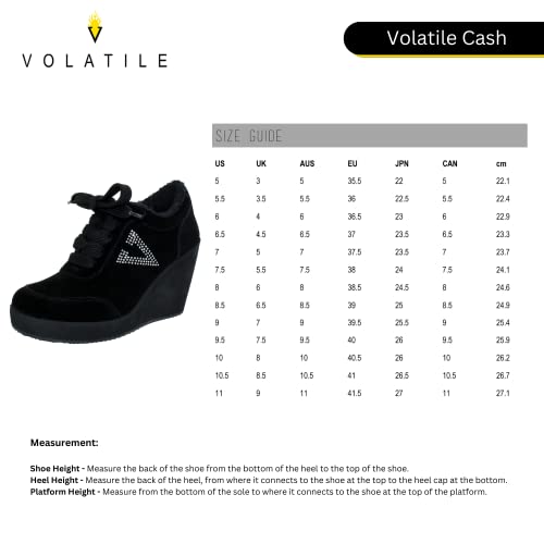 Fabric type: 100% SuedeOrigin: ImportedSole material: RubberPlatform height: 1FASHION WEDGE SNEAKERS: Elevate your sneaker game with VOLATILE Cash Fashion Wedge Sneakers, the ultimate platform tennis shoes for women.STURDY & plush: Designed with a sturdy and comfortable wedge that will take your style to new heights.ADDED TOUCH OF BLING: Sneakers feature rhinestones that add a touch of glamour to your everyday look.LACE-UP & CUSTOMIZABLE FIT: Lace-up design gives you a secure and customizable fit, while the black colorway makes them easy to pair with any outfit.FASHION & FUNCTION: Perfect for hiking, walking or even light athletic activities, these sneakers are sure to become your go-to shoe. Perfect for everyday use. first-class materials and excellent craftsmanship ensure long-lasting durability.