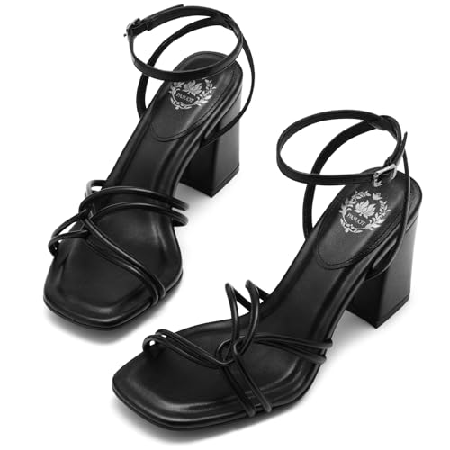 Pasuot Strappy Heels for Women - Open Square Toe Chunky Heeled Sandals Block Heel Ankle Buckle Strap Dress Shoes for Prom Party Wedding Black White Nude