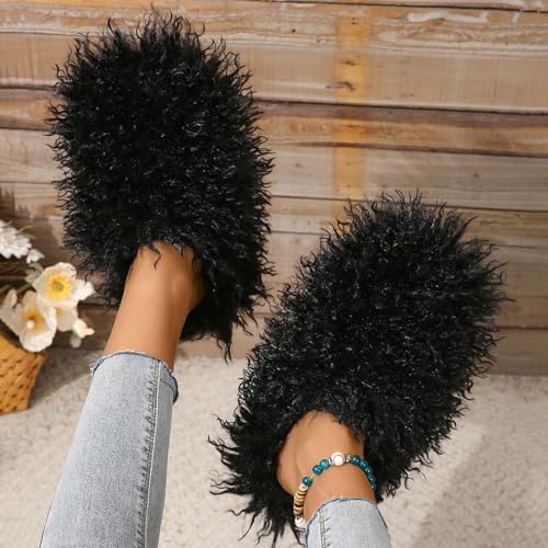 in-demand ! Unisex Fuzzy Faux Fur Slippers, Women's Fluffy Long Hair Sheep Faux Fur Slip on Slides, Girls Luxury Big Fluffy Outdoor Flat Slippers, Long Curly Hair Non-Slip heated Home Slide Shoes