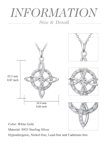 Material: Sterling SilverMetal type: Sterling SilverClasp type: LobsterChain type: CableMetal weight: 3.5 gGem type: DiamondWitches Necklace: Witches Knot is unbroken and never-ending, it cannot be broken making it a symbol of protection, represent the knot magic practiced by witches in the Middle Ages and was often scratched over doorways to keep away negative energy.Natural Diamond Pendant: This diamond Witches knot pendant is set with 12pcs natural and conflict-free diamonds(0.072ct) and a moissanite mainstone.Witches Necklace: Sliver Witches Pendant: 22.5mm(0.87''); Adjustable sterling silver chain: 18+2inches chain. s925 Sterling Silver made from 92.5% precious silver metal(Plated in 14k White Gold) that’s nickel-free and hypoallergenic, safe for sensitive skin.Witches Gifts: Witches necklaces is the fine jewelry gift for an Anniversary,Birthday,Engagement, Valentine's Day, Mother's Day, Christmas, or just any occasion and is a vintage infinity heart dangle necklace for any Woman such as a Bride, Bridesmaids, Fiancée, Wife, Valentine's Day Gifts for Girlfriend, Valentine's Day Gifts for boyfriend, Daughter, Granddaughter or even a GrandmotherZBA SERVICE: if you have any problem with the diamond Witches necklace for women, please feel free to contact us. We will do our best to help you. Perfect for everyday use. first-class materials and excellent craftsmanship ensure long-lasting durability.