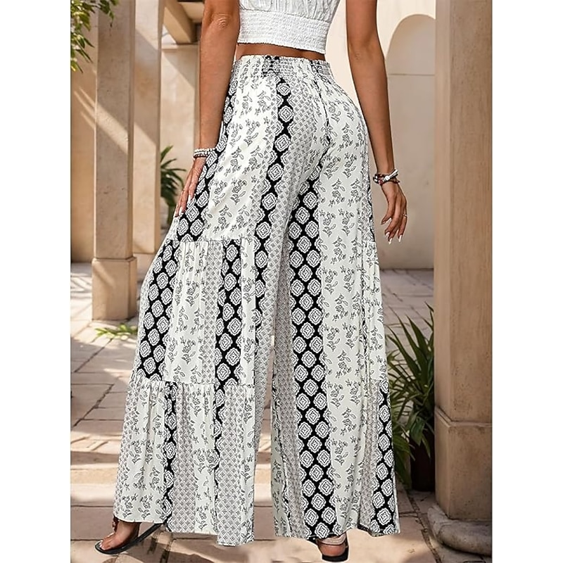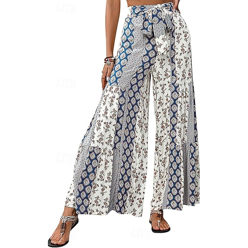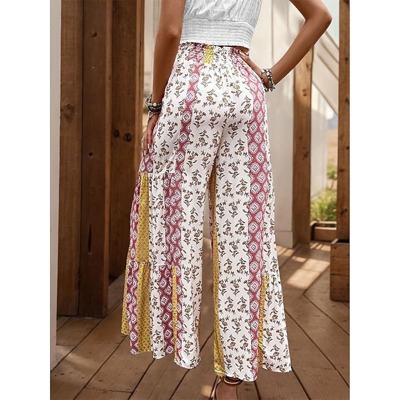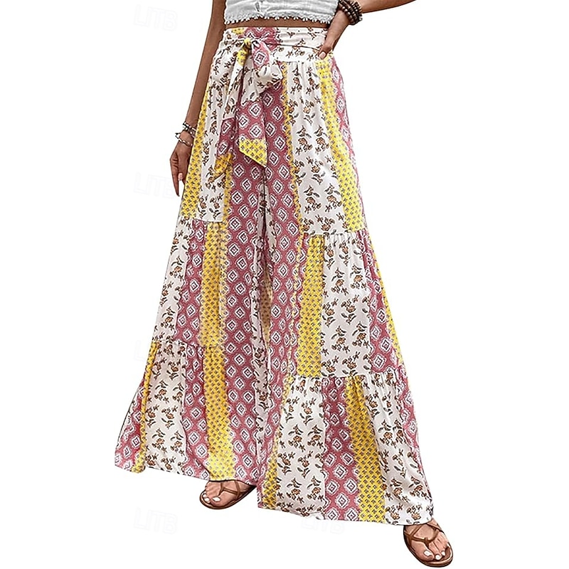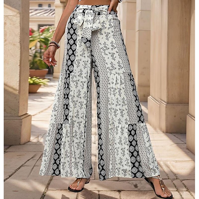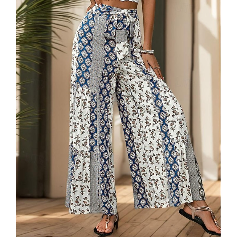Highlights [Fabric] Crafted from high-quality rayon, these pants offer a micro-elastic fit that combines breathability and comfort. The lightweight and silky material makes them perfect for everyday wear. [Fit] Featuring a full-length, wide-leg design, these palazzo pants are designed with a high waist to accentuate the figure. The flowing drape of the fabric ensures a relaxed and fashionable silhouette. [Design Highlights] These trousers showcase a solid color and color block pattern, with convenient pockets for added functionality. The waistline includes a sleek bowknot tie-up belt, providing an adjustable fit and playful touch to the overall design. [Occasions] Ideal for daily wear, vacations, and street outings, these versatile pants add comfort and style to any casual setting. Whether for a casual day out or a relaxed weekend getaway, they suit various occasions effortlessly. [Size Notice] Available in sizes S, M, L, and XL, these trousers cater to a wide range of body types. Choose the size that best fits your style and comfort preferences, and enjoy the perfect blend of fashion and functionality.