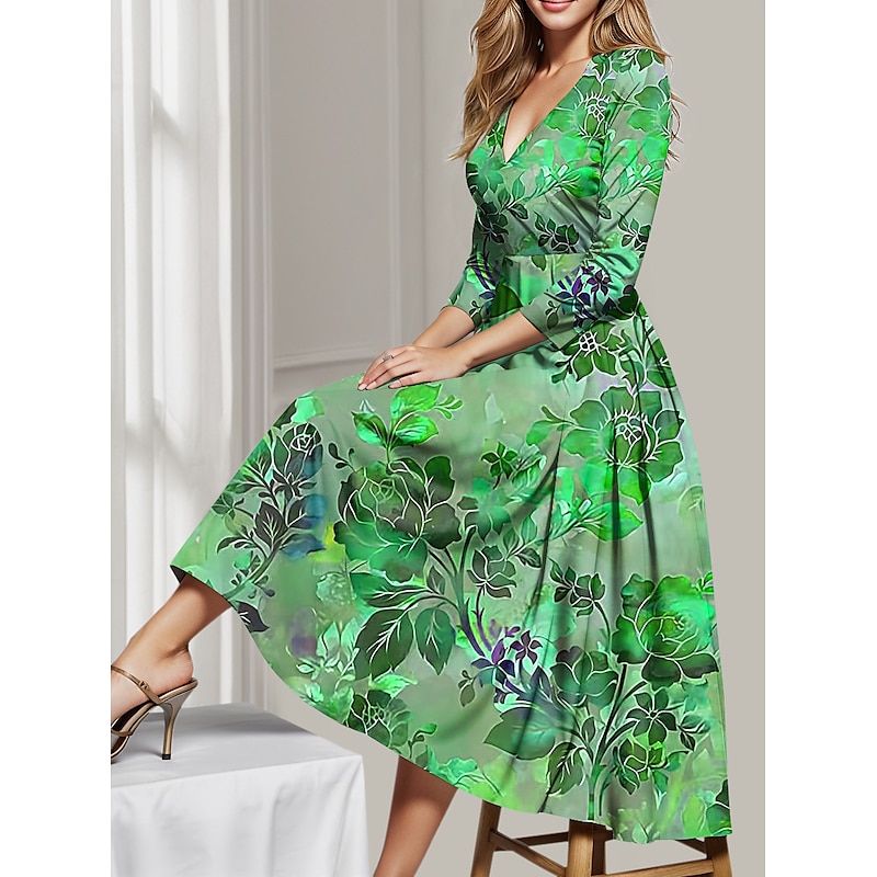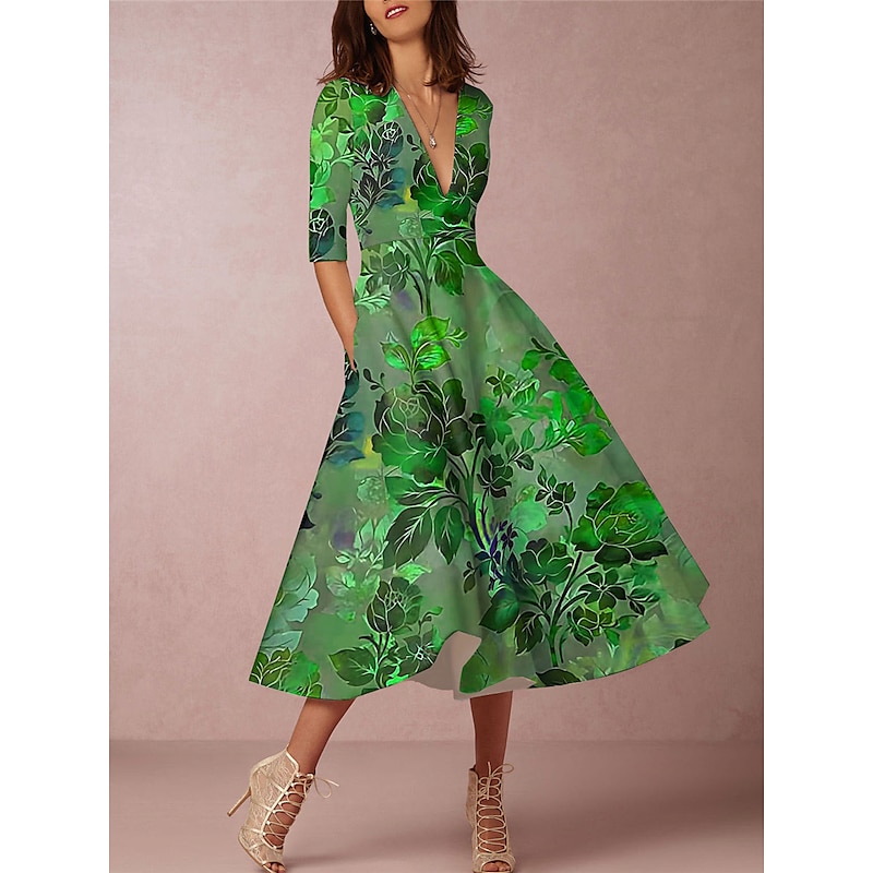 Women's Midi Dress Party Dress Cocktail Dress Wedding Guest Dress Swing Dress Fashion Party contemporary Formal Winter Dress Vacation Regular Fit Floral 3/4 Length Sleeve Deep V Red Blue Green Spring Fall