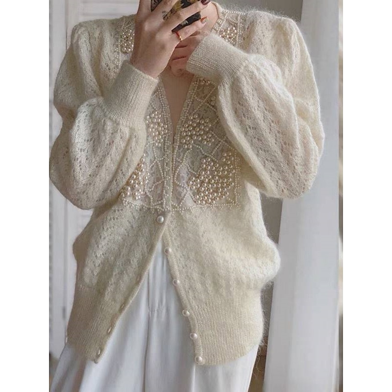 Why Choose Women's Sweater Cardigan Casual plush Pure Color Ribbed V Neck Lace Buttons Beaded Long Sleeve Regular Tops Knit Outdoor Daily Weekend Beige Fall Winter?
