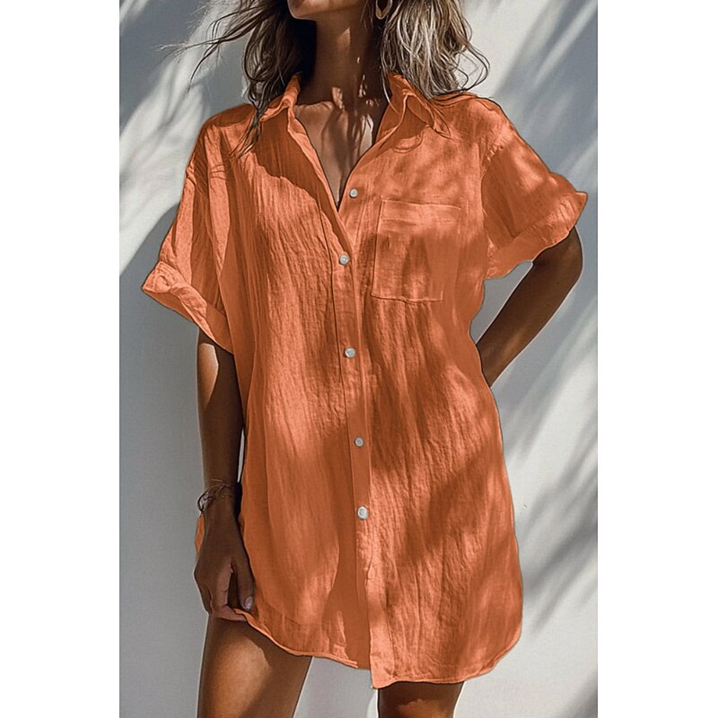 in-demand ! Women's Shirt Linen-Inspired Shirts Button Up Blouse Plain Basic Casual Short Sleeve Shirt Collar Long Tops Daily Holiday Buttons Pocket White Orange Green Apricot Light Blue Summer