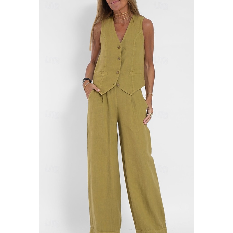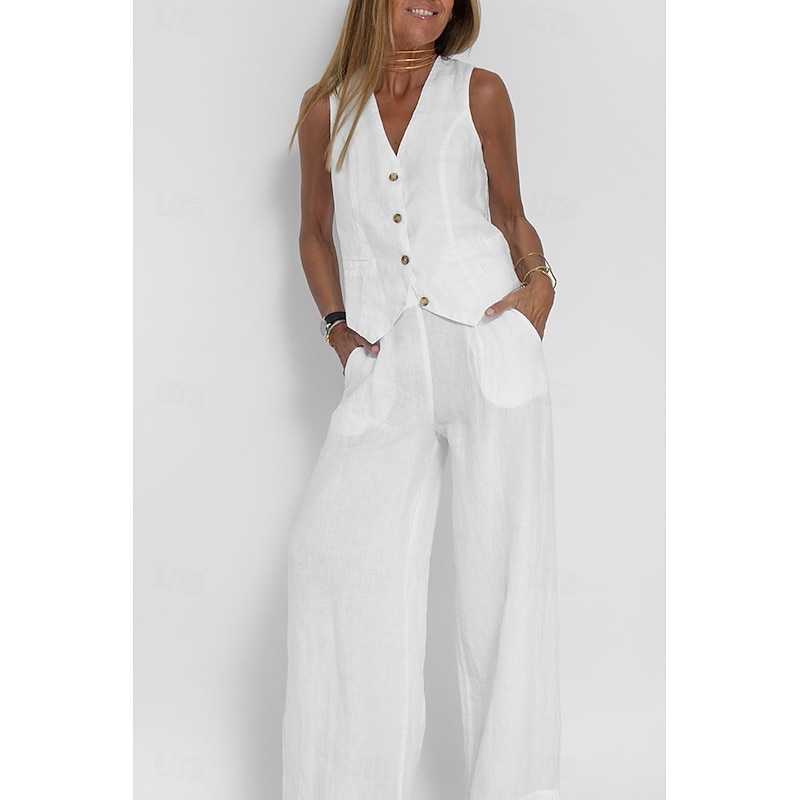in-demand ! Women's Active Basic Linen-Inspired Sets Two Piece Sets Blouse Sleeveless V Neck Solid Color Dubbele Rij Knopen Vacation Casual Daily Black White Wine Summer Regular Fit