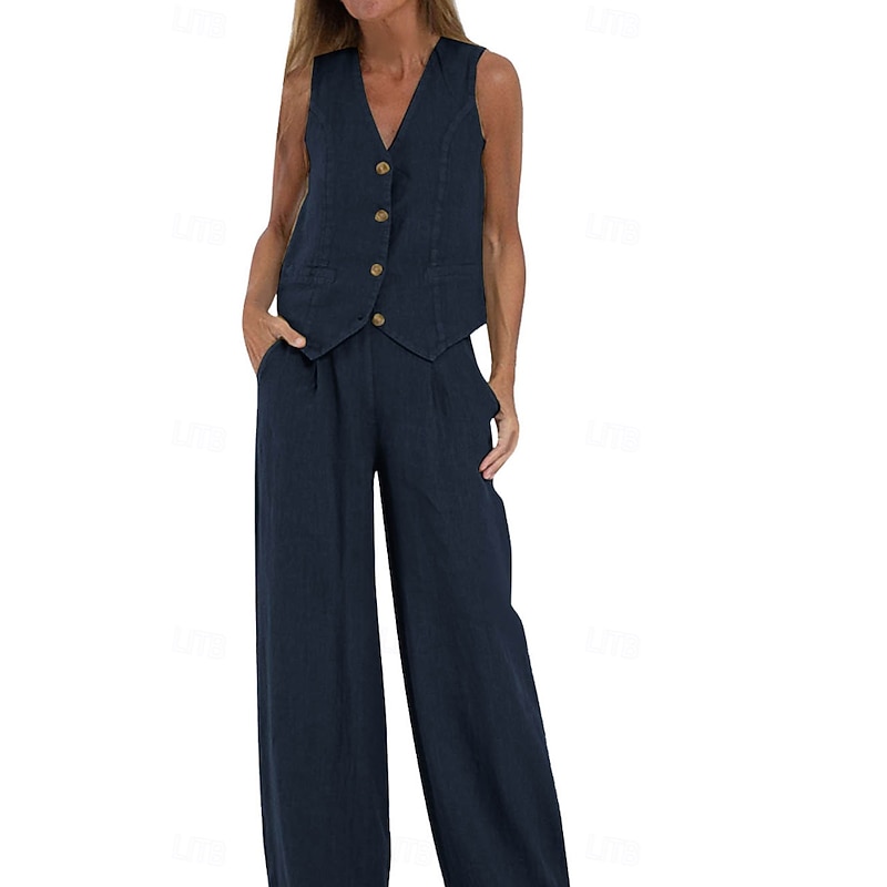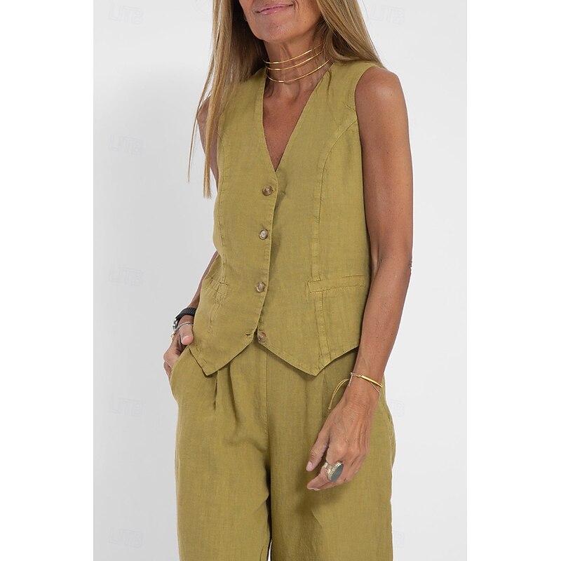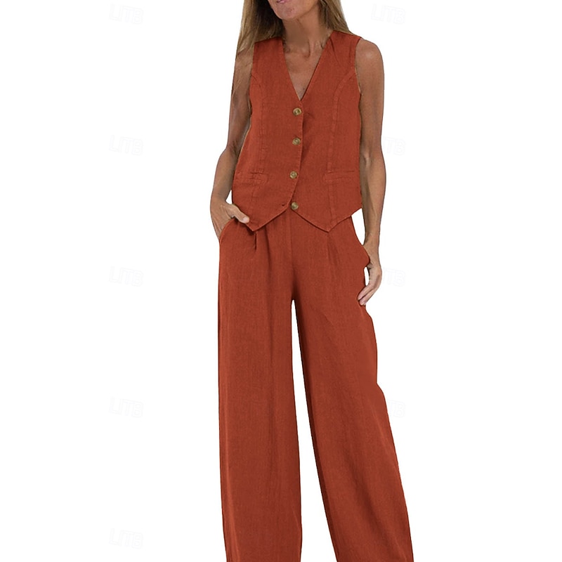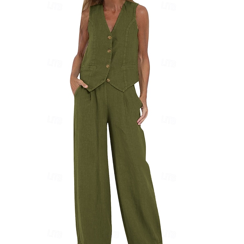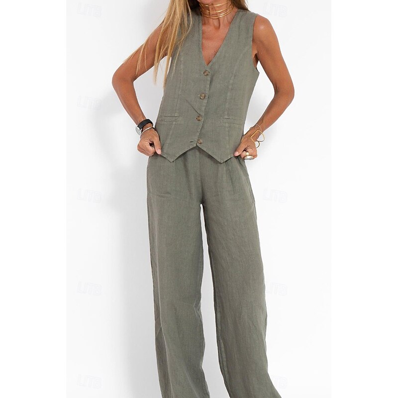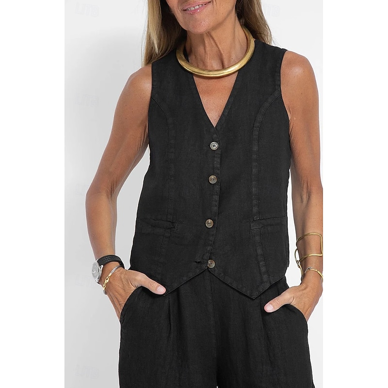 More information about Women's Active Basic Linen-Inspired Sets Two Piece Sets Blouse Sleeveless V Neck Solid Color Dubbele Rij Knopen Vacation Casual Daily Black White Wine Summer Regular Fit