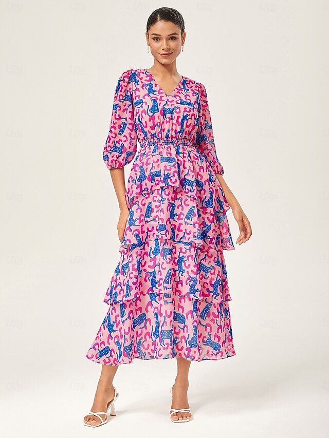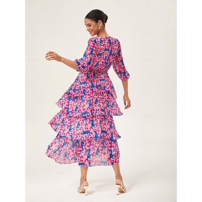 Elevate your spring, summer, and fall wardrobe with this stunning women's casual dress. Featuring an abstract pattern and a flattering V neckline, this midi dress is a must-have for any fashion-forward individual.