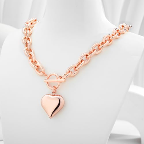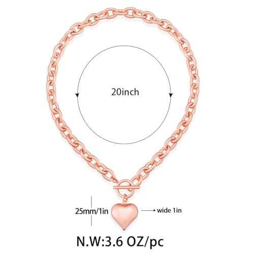 Material: MetalMetal type: Rose GoldClasp type: ToggleGem type: No GemstoneBold heart design: Features a thick chain with a striking puffy heart pendant, this rose gold necklaces is designed to make a bold statement.Perfect for layering or wearing solo for a chic touch.Large size: The 20-inch chain offers a robust, modern look, while the 25mm heart charm gives this chunky statement necklace an eye-catching focal point.Weighty and luxurious feel: At 3.6 oz, this heart necklace has a substantial, high-quality feel that complements its sophisticated, chunky design.Perfect for gifting: A meaningful and stylish piece, this heart pendant necklace makes an excellent choice for anniversaries, birthdays,Halloween,Christmas or special occasions.Customer-Centered Service: We guarantee quality and satisfaction. If you encounter any issues on this heart choker necklace, our dedicated customer service team is here to assist with hassle-free support. Perfect for everyday use. first-class materials and excellent craftsmanship ensure long-lasting durability.