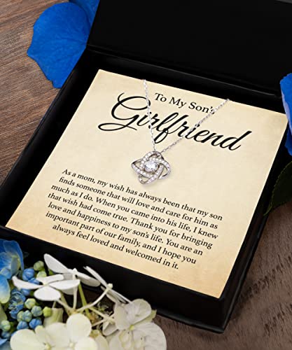 Material: Sterling SilverMetal type: Sterling SilverClasp type: Spring RingChain type: CableGem type: Cubic ZirconiaSon’s Girlfriend Necklace Gift: This charming 925 sterling silver necklace is the perfect gift for any special occasion. Glimmering with AAAA grade cubic zirconia jewels set throughout the pendant, it’s a stunning piece of jewelry that comes with a heartfelt message she is sure to love.Gift-Ready Box: Each necklace comes in a complimentary gift box in matte black for easy gifting. Box Size: 3.5 x 3.5 x 1 inch (8.89 x 8.89 x 2.54 cm).Heartfelt Message: A card rests under the necklace and says “As a mom, my wish has always been that my son finds someone that will love and care for him as much as I do. When you came into his life, I knew that wish had come true. Thank you for bringing love and happiness to my son’s life. You are an important part of our family, and I hope you always feel loved and welcomed in it.”Necklace Details: The chain length is 15.75 inches including a 1.97 inch extender. The pendant is 0.61 inches (15.5mm) in length and 0.61 inches (15.5mm) in width. The pendant can be removed from the chain. Necklace weight is 0.11 oz. The necklace is made of first-class 925 sterling silver. The centerpiece stone as well as the jewels throughout the pendant are AAAA grade cubic zirconia, which are polished to perfection. Perfect for everyday use. High quality materials and excellent craftsmanship ensure long-lasting durability.