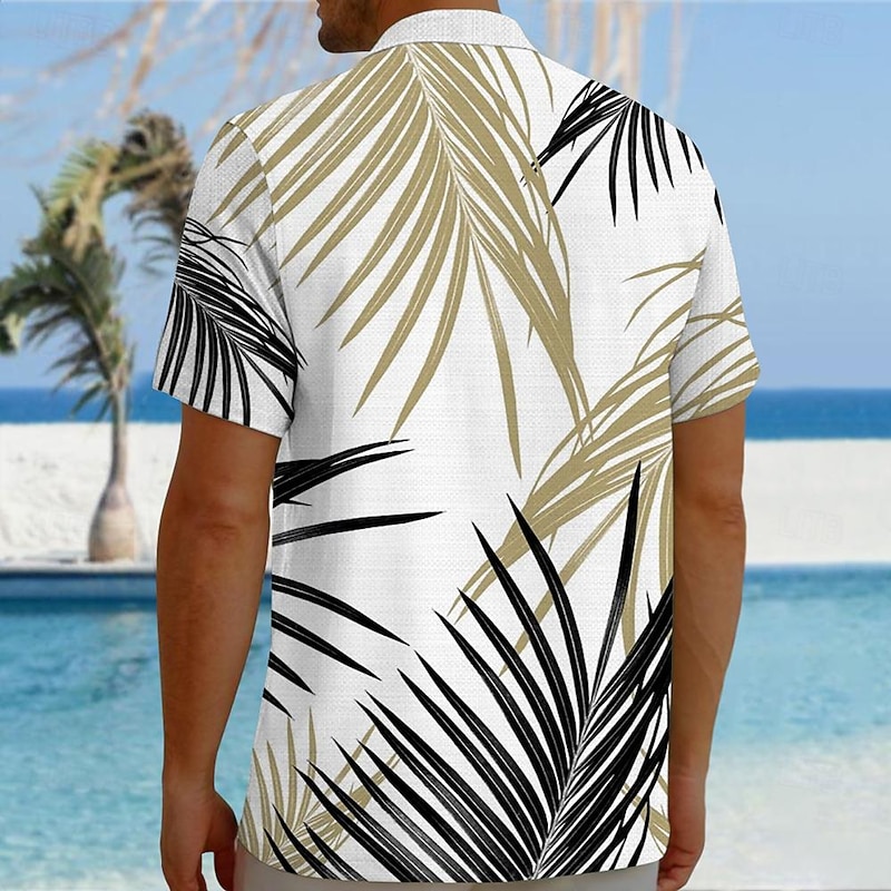 : The shirt stands out with its vibrant palm leaf and tropical plant pattern, set against a crisp white background. The design incorporates a traditional turndown collar and a practical button-down front, providing both style and versatility. This timeless piece seamlessly combines casual and resort styles, making it an essential for summer fashion.