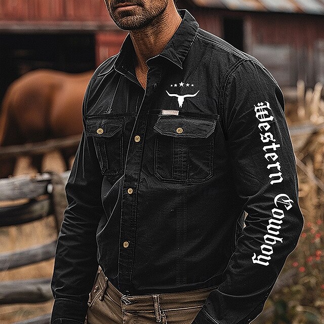 Highlights [Fabric] : Crafted from a durable cotton blend, this men's shirt ensures breathability and resilience, making it ideal for outdoor activities while maintaining comfort and style throughout the day. [Fit] : Designed with a regular fit, this shirt balances style and comfort, offering ease of movement. Its long sleeves and tailored silhouette provide a streamlined look suitable for various activities. [Design Highlights] : This Western-inspired shirt features a bold letter print with Western Cowboy on the sleeves, capturing an authentic cowboy aesthetic. The fold-over collar and button-down front lend a classic touch, while the two chest pockets with button closures contribute both functionality and style. A subtle bull skull logo adds to the shirtโs distinctive Western charm. [Occasions] : Perfect for sports and outdoor adventures, this shirt is well-suited for camping, hiking, and casual outings. Its tactical style also makes it an ideal choice for themed events or anyone looking to embrace the Western spirit. [Size] : Available in a range of sizes from S to 2XL, ensuring a suitable fit for adults seeking a practical and fashionable addition to their wardrobe. Perfect for everyday use. supreme materials and excellent craftsmanship ensure long-lasting durability.
