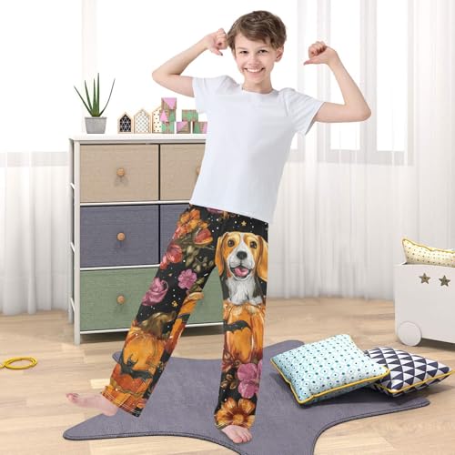 Beagle Pumpkin Bat Flowers Boys Long Pants silky Trousers Elastic Waist Kids Lounge Bottoms with Pockets S-XL