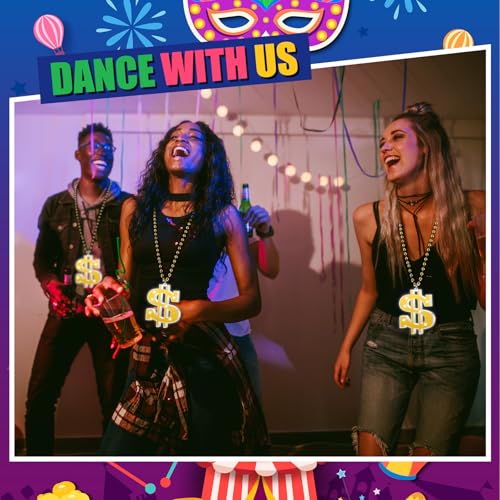 Item width: 7.87 inchesMaterial: PlasticMetal type: No Metal TypeGem type: No GemstonePackage List: the package contains 6 pieces of LED dollar sign necklaces, you can adjust the flashing frequency of lights according to your preferences, can match your different outfits, making you stand out, showing your attitude and personalityShiny and Eye catching Design: the fake dollars necklace with Mardi Gras beads features eye catching and distinctive designs, you can detach the pendant and necklace by hand, with intricate and delicate details, can embellish your outfits, adding an exciting atmosphere, and ideal for displaying in various placesSize Information: the dollar sign necklace measures approx. 37.4 inches/ 95 cm long, and the pendant measures approx. 4.33 inches/ 11 cm in length, approx. 3.54 inches/ 9 cm in width, and the thickness is approx. 0.71 inches/ 1.8 cm, sturdy and lightweight, easy to wear and remove, with smooth surfaces, causing no harm to your skin, suitable for various parties, you can apply them comfortably for a long timeAdjustable Design: the plastic gold chain is designed with adjustable LED lights, which can easily adjust the flashing frequency to suit your personal style and mood, easily attract everyone's attention, suitable for carnivals, Halloween, retro parties, and moreWarm Notes: the LED gold beads necklaces contain replaceable batteries, you can turn on the light by taking out the electronic plug, the model of the button battery is CR1220, and the product is not suitable for children under the age of 13. Tip: This product is prone to color fading and paint peeling at high temperatures. Please store it in a cool and shady place Perfect for everyday use. supreme materials and excellent craftsmanship ensure long-lasting durability.