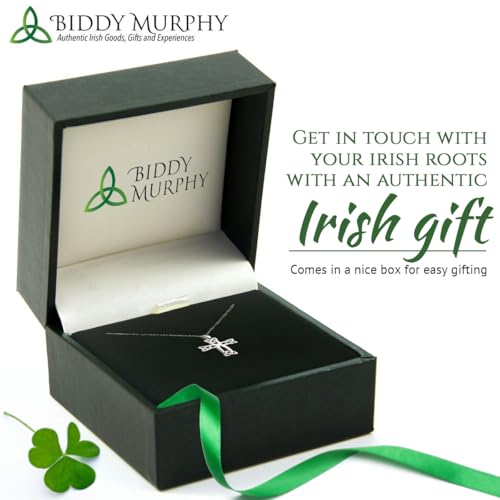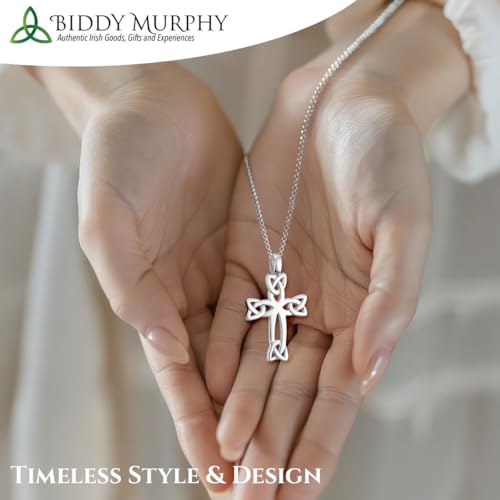 Item display length: 18 inchesItem width: 0.63 inchesMaterial: Sterling SilverMetal type: Sterling SilverClasp type: Spring RingChain type: RoloThis sterling silver Celtic cross pendant features contemporary Irish design. The plain cross is completed with Trinity Knot elements on each end to represent never ending love โ with no beginning and no end.The cross pays homage to the high crosses of Ireland that date back to the 9th century.Timeless Design: This Celtic cross features the Triquetra or trinity knot design. 0.63 wide x 1.14 tallSterling Silver 18 Trace chain; Irish hallmarked by the Assay office at Dublin castle. Wear this Celtic Cross daily as an Irish symbol of faith.Biddy Murphy sells authentic Irish goods crafted by maker-partners across Ireland and proud to offer you products that will bring the spirit of the Emerald Isle to you and the ones you care for the most; Includes gift box faultless for everyday use. first-class materials and excellent craftsmanship ensure long-lasting durability.