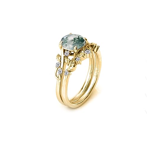 Natural Moss Agate Ring Solid 10K/14K/18K Gold Green Leaf Moss Agate Engagement Ring with Cubic Zirconia Engraved Name Wedding Bands for Women