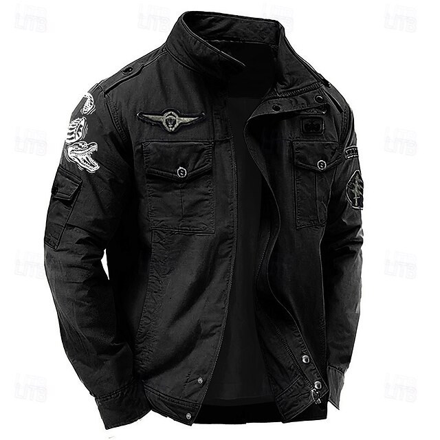 in-demand ! Men's Cotton Embroidered Military Jacket Windbreaker with Shoulder Straps Long Sleeve Standing Collar Multi-Pockets Trucker Jacket Crocodile Print Tactical Outerwear