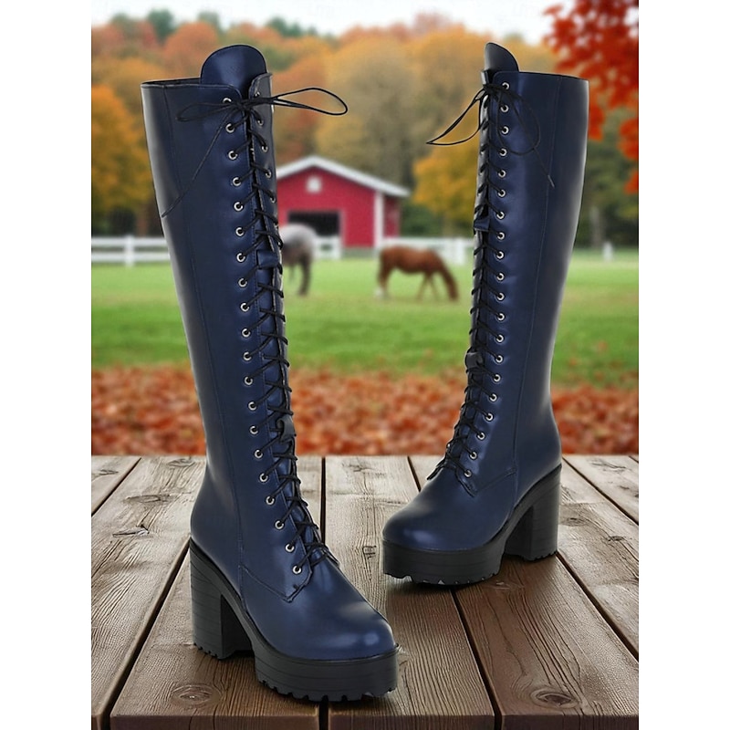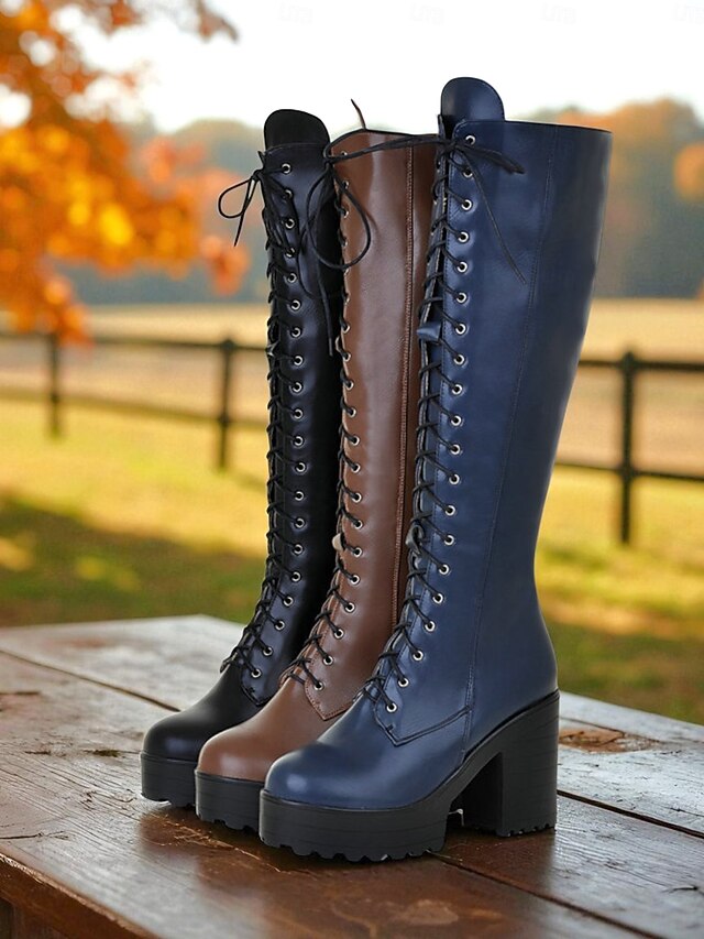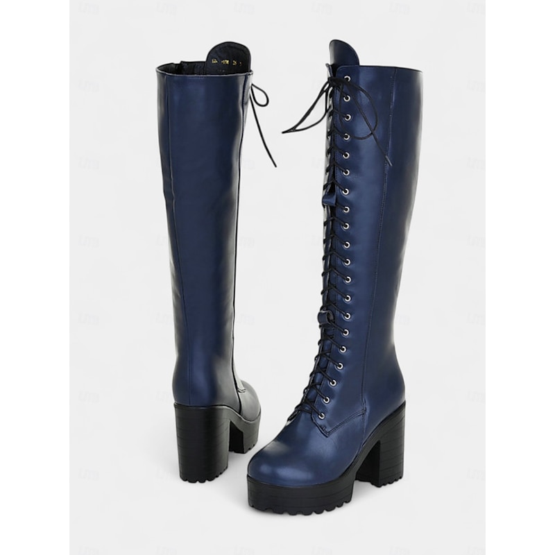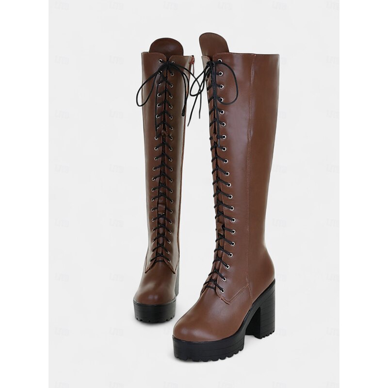 in-demand ! Women's Black Platform Knee-High Lace-Up Boots - Faux Leather Chunky Heel Gothic Boots for Fall Winter Streetwear , Daily Outfits and Halloween Fashion