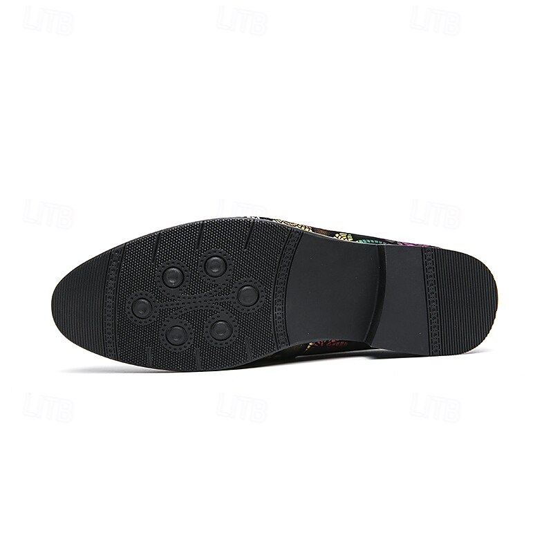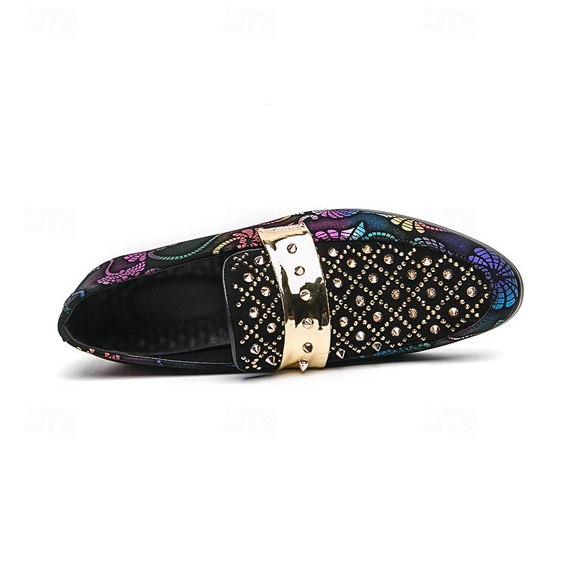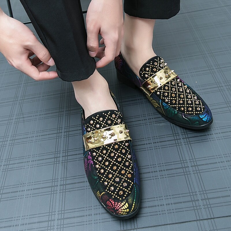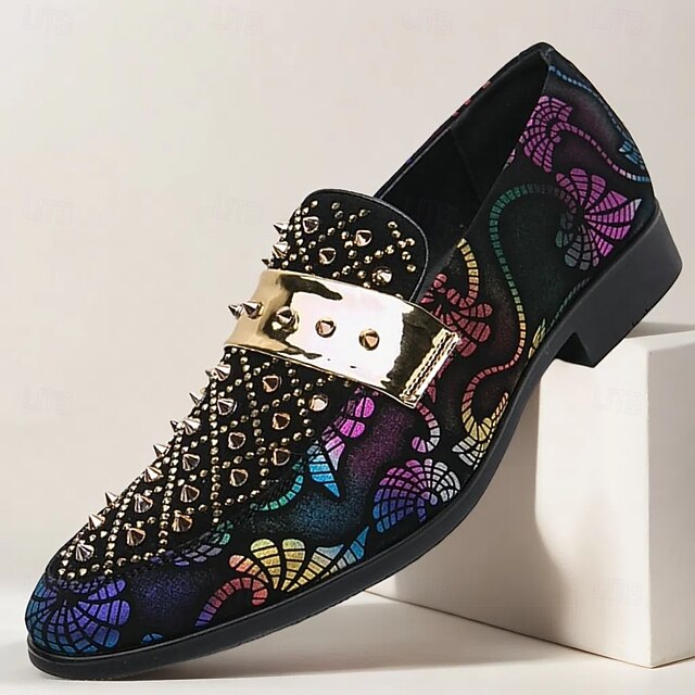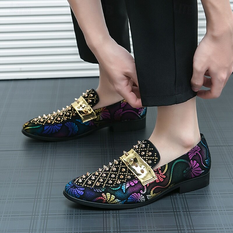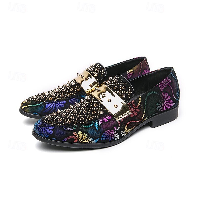 Highlights [Fabric] : Crafted with quality PU leather, these men's loafers boast a smooth and luxurious feel. The lining is also made from PU material, ensuring a comfortable fit with every step. [Style] : Designed as a sleek slip-on loafer, these shoes offer both ease and sophistication. The round toe shape adds a classic touch, making these loafers a versatile choice for various occasions. [Design Highlights] : The standout feature of these loafers is the decorative metallic gold band across the top, embellished with edgy spike studs. This bold detail adds a up-to-date glam and attitude to any outfit. The vibrant multicolor paisley pattern on a velvet base further enhances the shoe's special appeal. [Occasions] : Perfect for formal and semi-formal settings, these gothic style loafers are ideal for anyone looking to make a bold fashion statement. Suitable for events where style and personality are paramount, they add distinctive flair to any wardrobe. [Size Range] : Available in a comprehensive range of sizes to ensure the perfect fit: US7 / EU39 / UK6, US7.5 / EU39 / UK6.5, US8 / EU40 / UK7, US8.5-9 / EU41 / UK7.5-8, US9.5 / EU42 / UK8.5, US10 / EU43 / UK9, US10.5 / EU43 / UK9.5, US11 / EU44 / UK10, and US11.5 / EU45 / UK10.5.