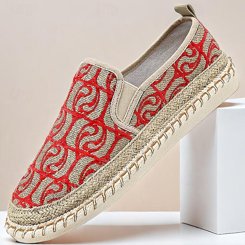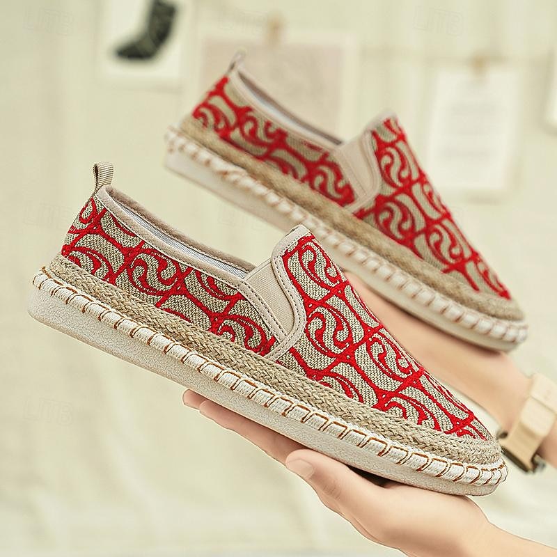 Men's Embroidered Espadrilles - relaxing Canvas Fisherman Shoes with Red Pattern for Casual and Beach Wear