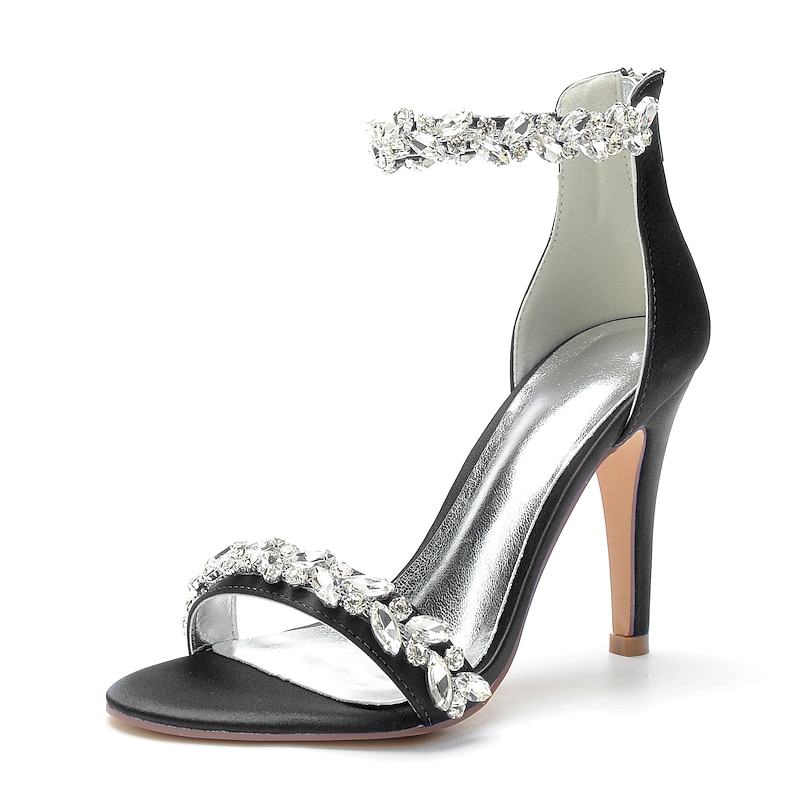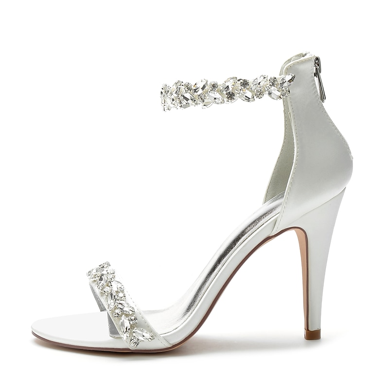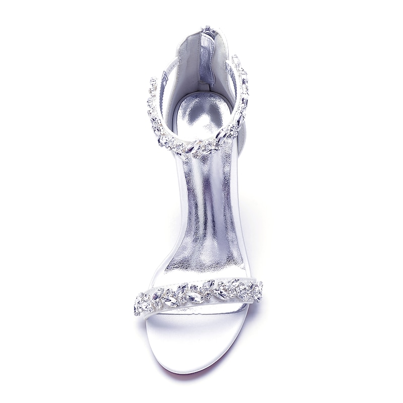 : The sandals are adorned with sparkling crystal embellishments on both the ankle and toe straps. These rhinestones catch the light beautifully, providing a glamorous sparkle that is sure to draw attention. An adjustable zipper closure at the ankle ensures a secure and comfortable fit, while the padded footbed offers enhanced comfort for extended wear.