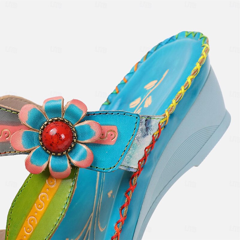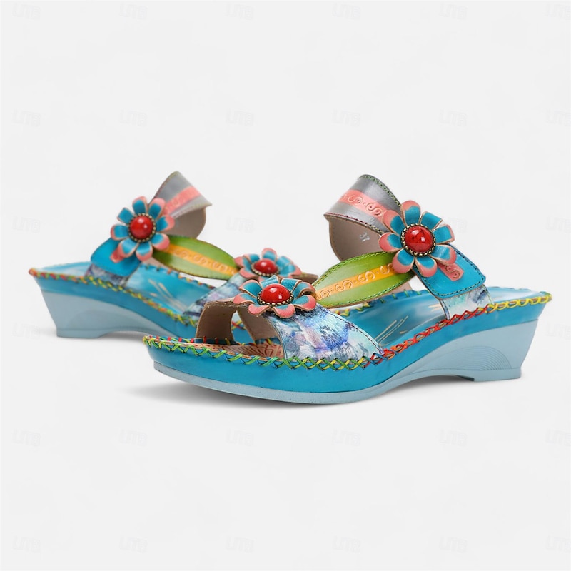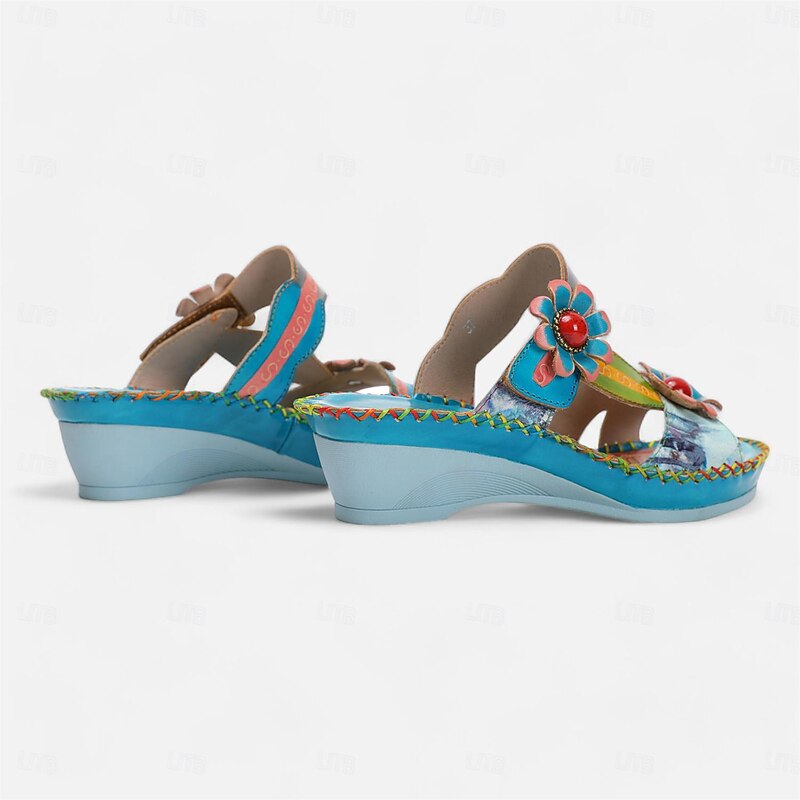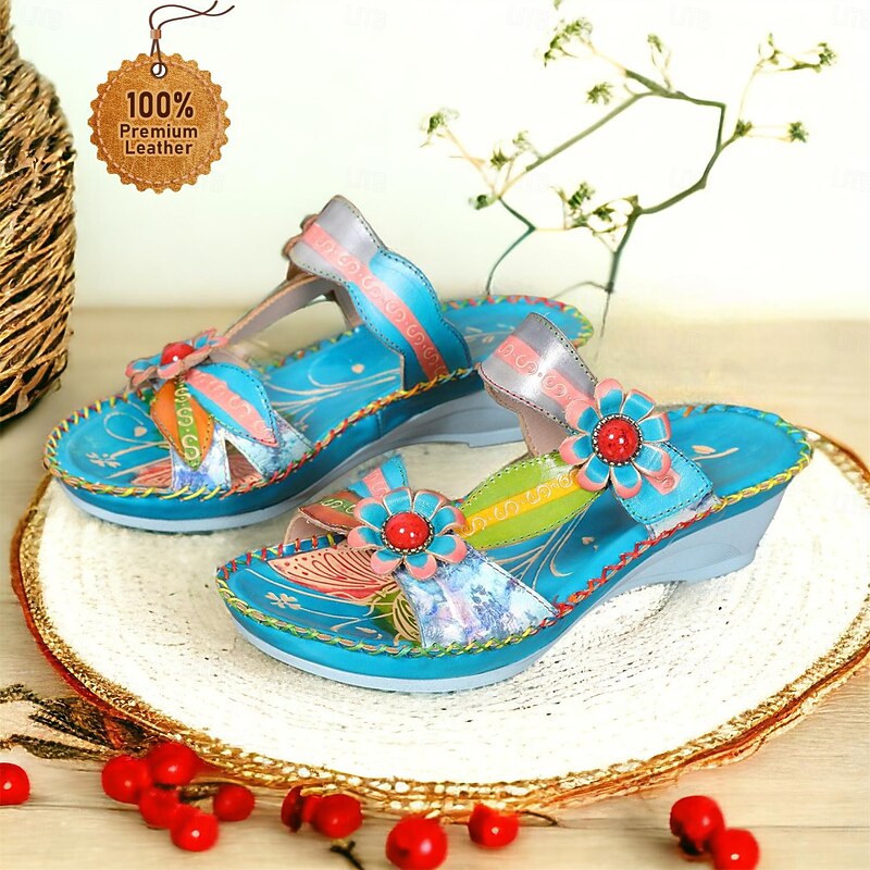 in-demand ! Women's Colorful Floral Wedge Sandals with Hand-Painted Leather and Embossed Details, Bohemian Open Toe Summer Slides for Casual Outfits and Vacation