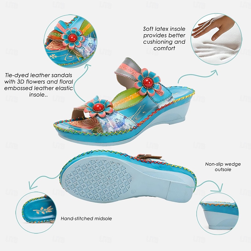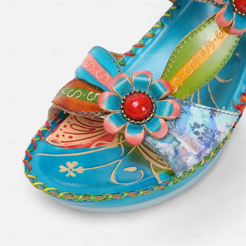 More information about Women's Colorful Floral Wedge Sandals with Hand-Painted Leather and Embossed Details, Bohemian Open Toe Summer Slides for Casual Outfits and Vacation