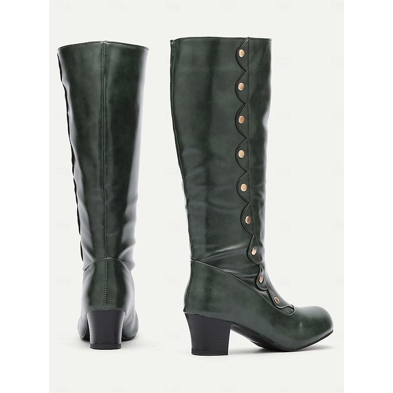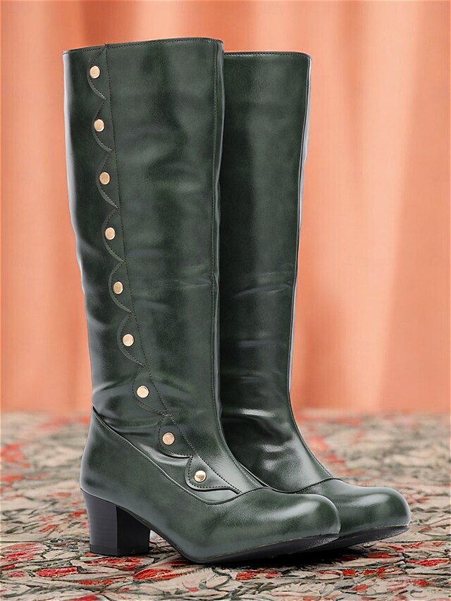 Women's Green Knee-High Vintage Fashion Boots - fashionable Button-Decorated Heeled Boots for Fall and Winter, superb for Casual and Formal Wear