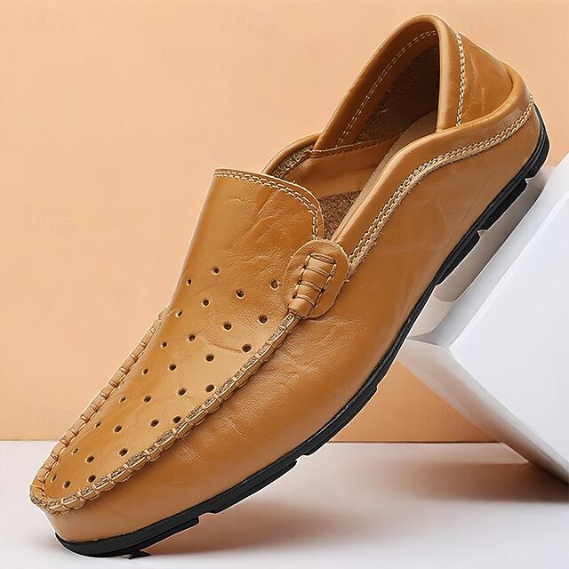 Highlights Product Highlights: [Material] Crafted from high-quality genuine leather, these men's loafers offer a sleek and sophisticated look that ensures both style and comfort. The leather upper brings a touch of elegance, perfectly complemented by its intricate perforation design that enhances breathability. [Fit] Designed in a vintage slip-on style, these loafers provide a convenient and hassle-free wearing experience. The round toe shape offers ample room for the toes, ensuring comfortable wear throughout the day. [Design Highlights] These loafers feature reinforced stitching for durability and a decorative touch that enhances the overall aesthetic. Their inner lining is soft and ensures prolonged comfort, while the tan leather exterior is versatile for both casual and semi-formal settings. The rubber outsole provides excellent grip and flexibility, with a slip-resistant tread for enhanced stability. [Occasions] Ideal for a variety of occasions, these loafers effortlessly transition between casual and formal settings. Whether you're heading to a weekend gathering or a business-casual event, these shoes add a timeless touch to any outfit. [Size Range] Available in a variety of sizes to ensure a perfect fit: US6 to US11.5. These loafers cater to a range of foot sizes, promising comfort and style for every individual. Perfect for everyday use. first-class materials and excellent craftsmanship ensure long-lasting durability.