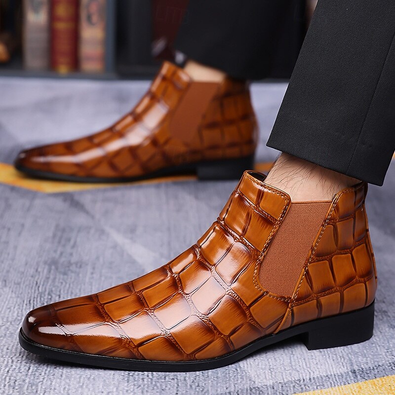 in-demand ! Men's Brown Crocodile Pattern Chelsea Boots – Faux Leather Ankle Boots with Elastic Side Panels, Vintage Style Dress Boots for Office and Evening Wear