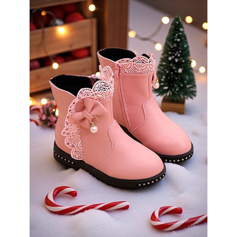 Why Choose Girl's cozy Winter Boots with Fur Lining - Red Ankle Boots with Lace Bow Detail, Cozy Fashion Style for Kids Cold Weather Wear?